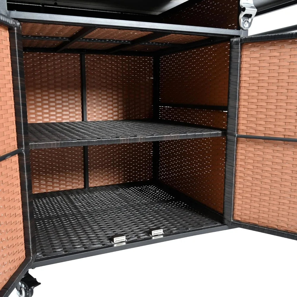 - Smart storage and mobility include two open shelves (13.7” x 23.2” x 14.7”), a two-tier enclosed cabinet (25.6” x 24” x 11.4”) with doors, a top storage area (25.6” x 24” x 5.3”), built-in bottle opener, and lockable wheels.