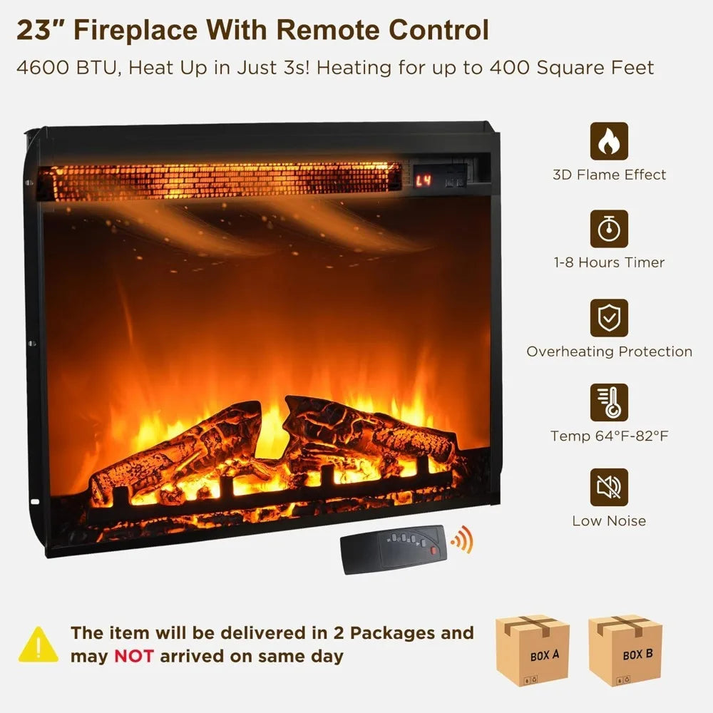 - 23" electric fireplace with remote control and separate flame/heat; adjust brightness, temperature, and timer from the panel or remote for personalized ambiance.