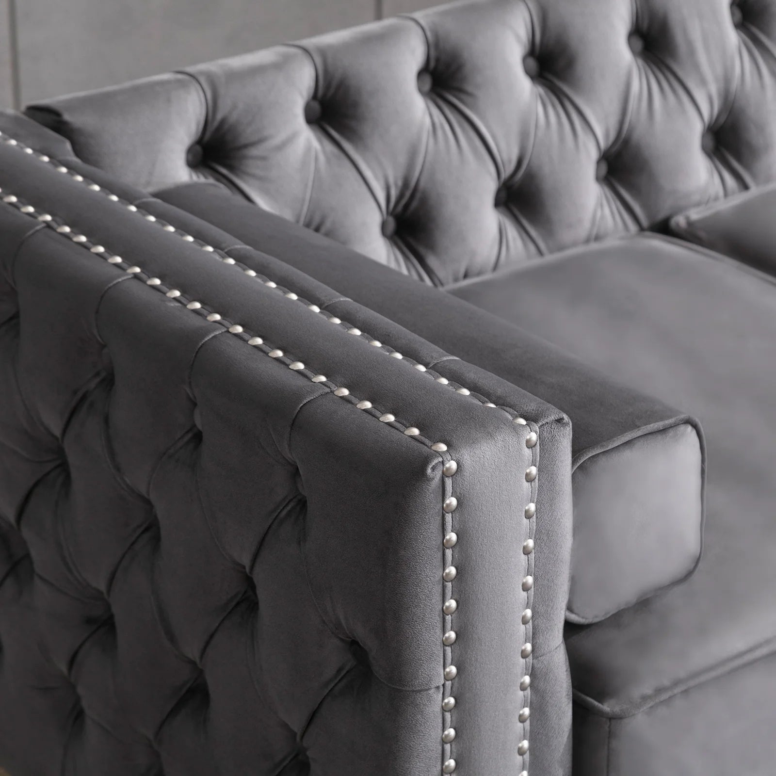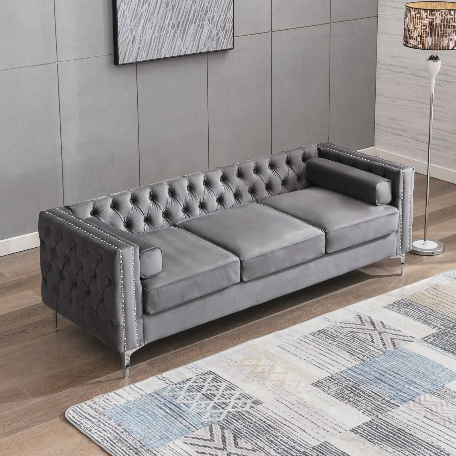 - Comfort and style come together with skin-friendly velvet, button tufting and rivets, high-density sponge cushions, plus included throw and bolster cushions; overall size about 215 cm L × 76 cm D × 71 cm H, with assembly required.