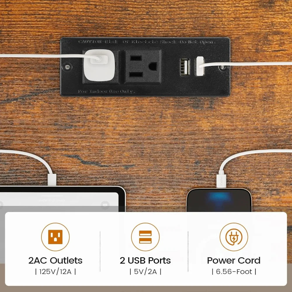 - You can charge up to four devices via a 2-outlet + 2-USB hub and illuminate your desk with RGB LED lighting controllable by an app, featuring 60,000+ colors and 29 modes.