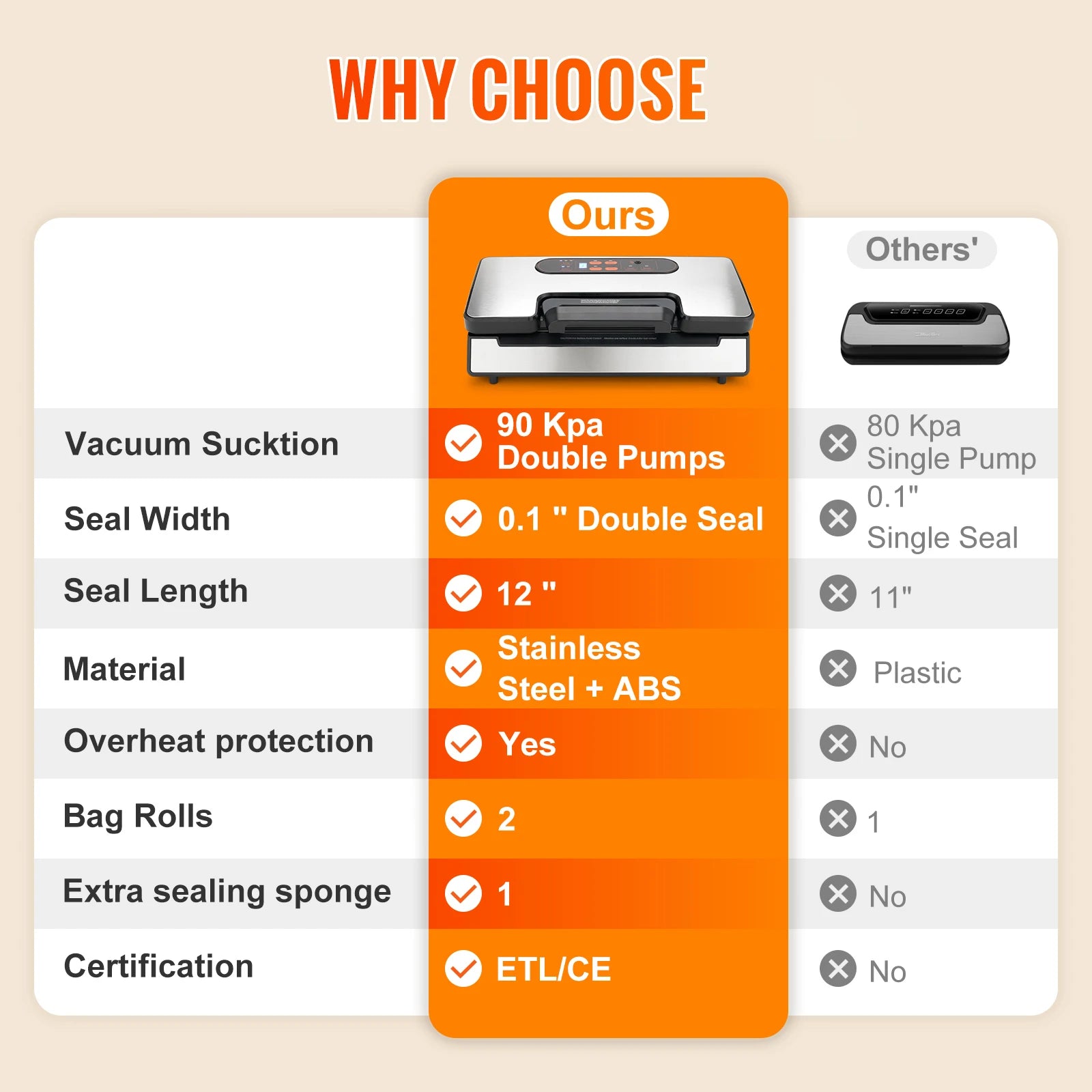 - Sealed Fresh: 90KPa suction from dual pumps and two sealing strips deliver airtight packs, keeping food fresher longer and reducing waste.